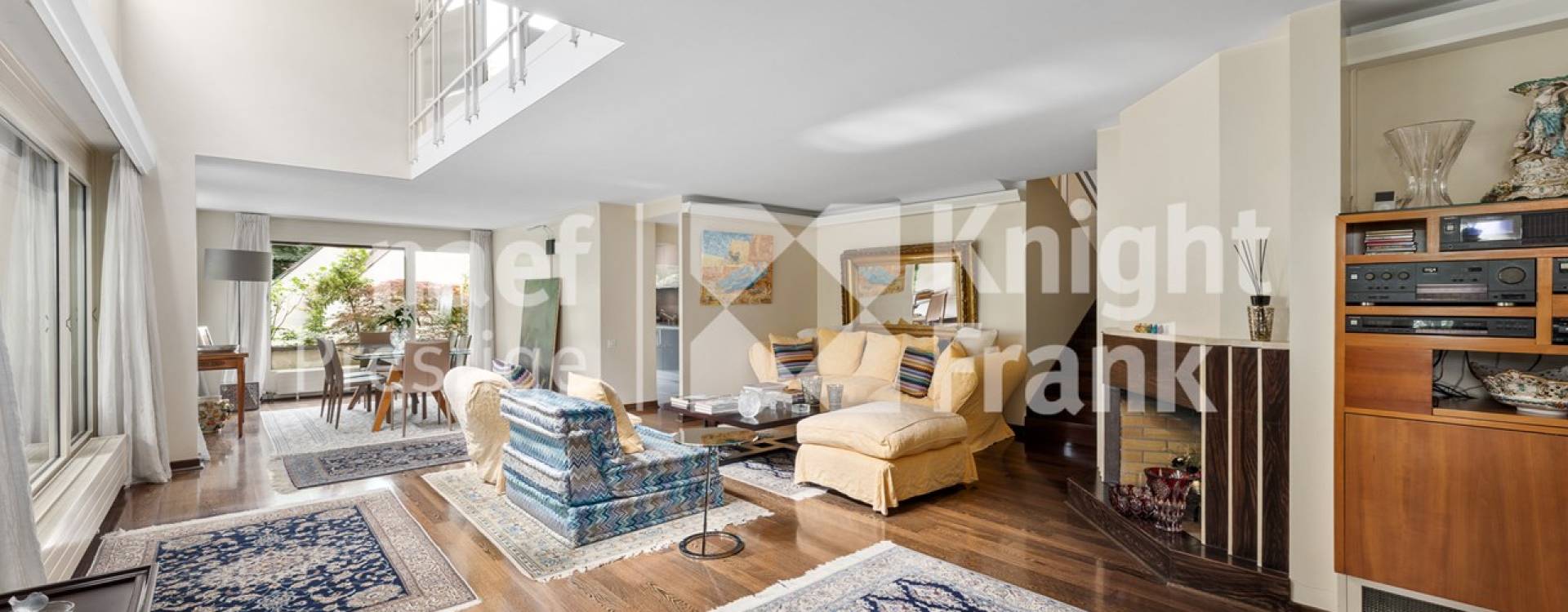 L’espace de vie comprend un vaste salon et une salle à manger ouvrant sur une terrasse orientée vers le parc, créant une continuité harmonieuse entre intérieur et extérieur. Un espace TV et bibliothèque complète ce lieu de convivialité et de détente.