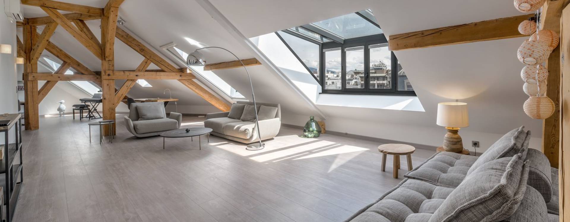 Niché au sommet d’un élégant immeuble de Maître en pignon, au cœur du centre-ville genevois, cet appartement d’exception occupe les combles de ce bâtiment de cinq étages, accessibles directement par ascenseur.