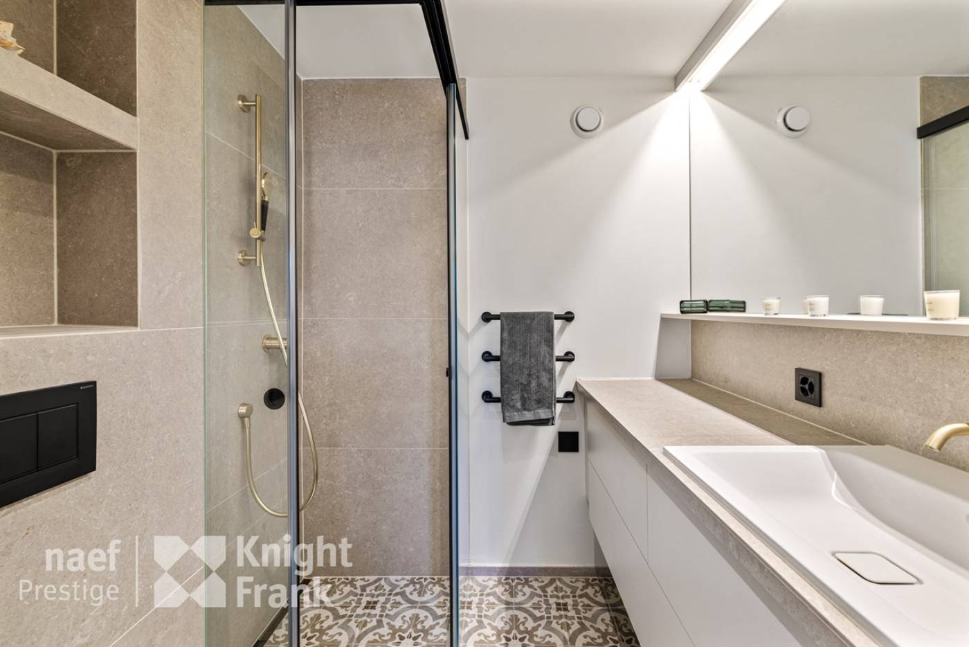 Exposé plein sud avec une vue sur les Alpes, cet appartement lumineux comprend deux chambres, deux salles de douche, un studio indépendant, une grande terrasse avec jardin, ainsi que deux places de parc intérieures.