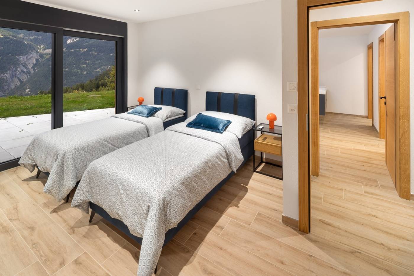 Située à Lens, à cinq minutes de Crans-Montana et répartie sur deux niveaux, la propriété dispose de quatre chambres avec accès direct au jardin. Deux d’entre elles comprennent une salle de bains privative, tandis que les deux autres disposent chacune d’une salle de bains privative située juste de l’autre côté du couloir. Un salon lumineux avec une cuisine ouverte et une vue panoramique exceptionnelle complète l’aménagement.