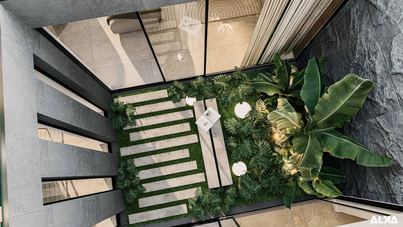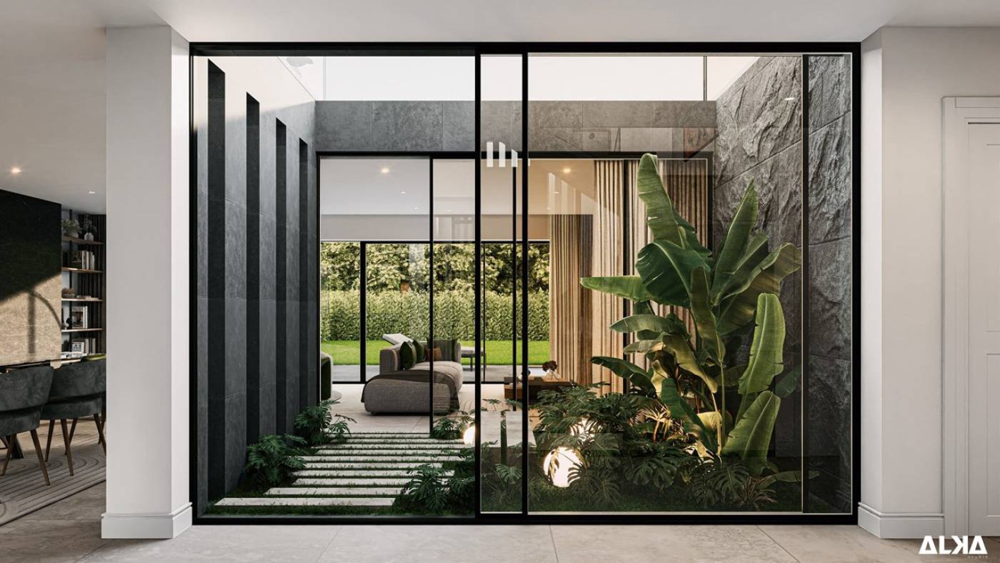 Le rez-de-chaussée offre de beaux espaces de vie s’ouvrant sur un patio intérieur aménagé ainsi qu’une terrasse avec jardin et piscine.