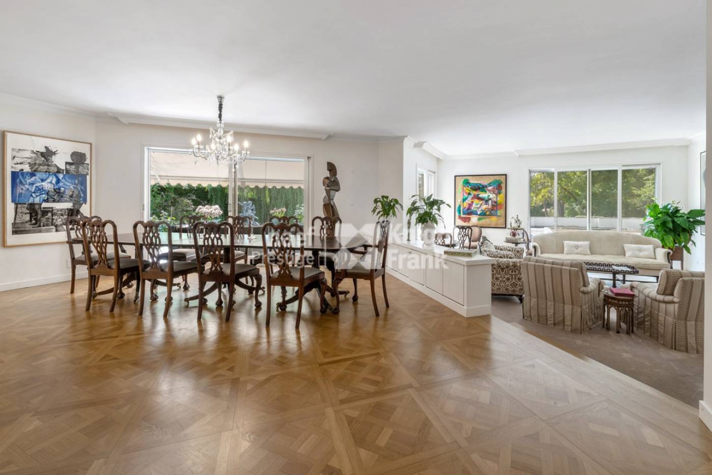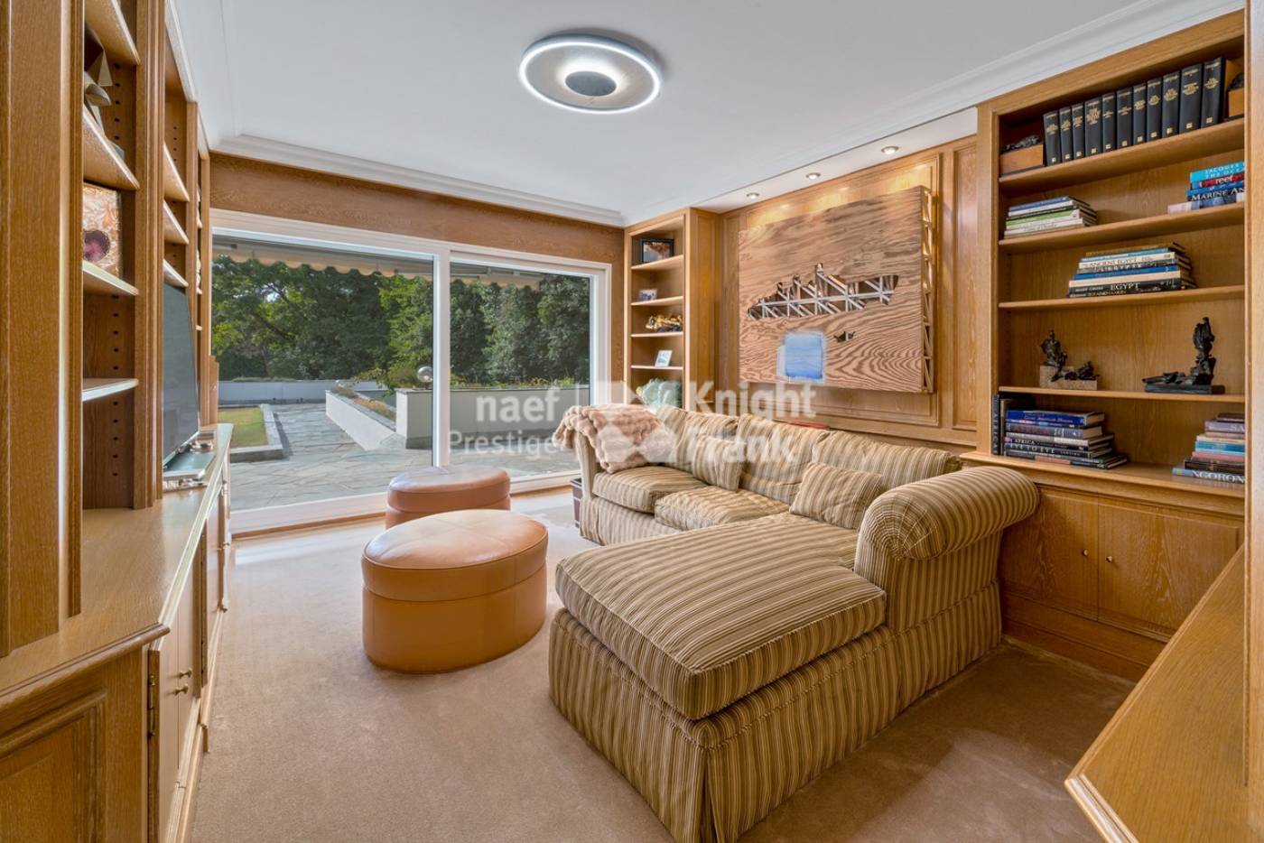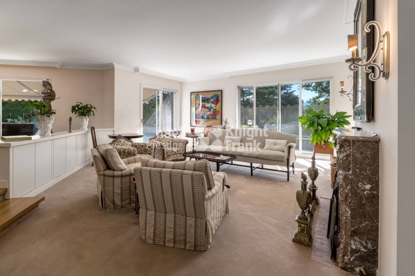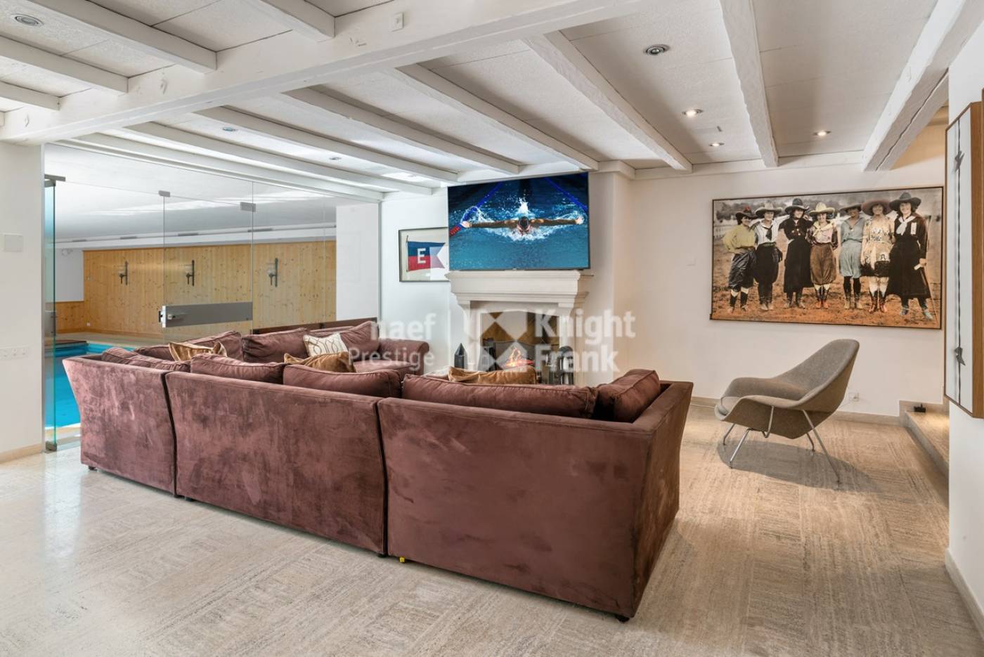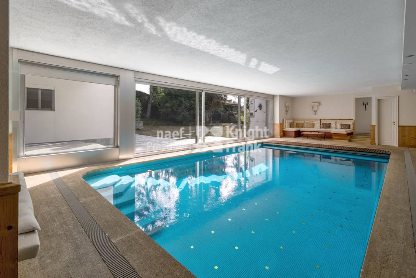 Une grande piscine intérieure donnant sur le jardin, un appartement pour le personnel composé d’un salon, d’une chambre, d’une salle de bains ainsi qu’un garage pour deux voitures complètent cette grande propriété.