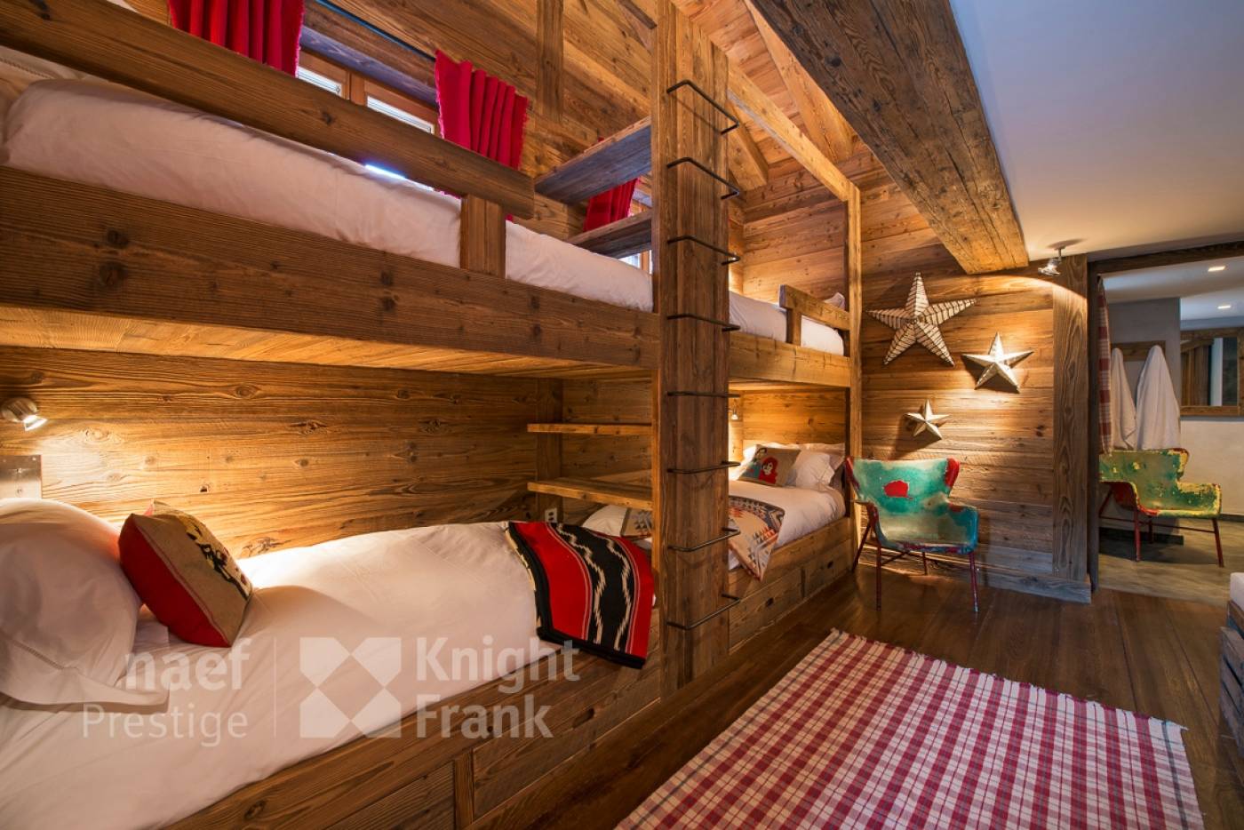 Floors features a sumptuous master suite with balcony and mountain views, three double bedrooms with balconies, and a family bedroom with handcrafted bunk beds.